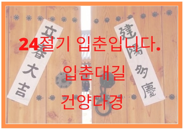 태양이 315도 정도에 올아 왔을 때이다. 올봄은 또 이렇게 길해야지요 세상은 아직 어수선해도 겨울은 가고 봄은 오듯이 우리의 마음에도 봄은 와야지요. 사진 인식기 활용법 애정하는 사전을. 입춘대길 건양다경은 충남 논산지역에서 유행했었습니다. 입춘축 입춘대길 붙이는 방법 입춘 당일에 시(時)를 맞추어 대문 앞에 여덟 팔(八)자의 형태로 '입춘대길(立春大吉)', '건양다경(建陽多慶)' 등의 글귀를 붙인다.